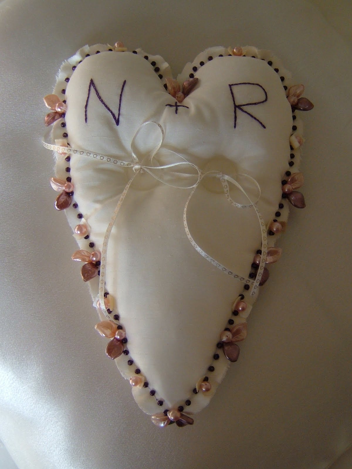 A beautiful cushion, I really like the beads around the outside and what a great idea to tie the rings on with ribbons!