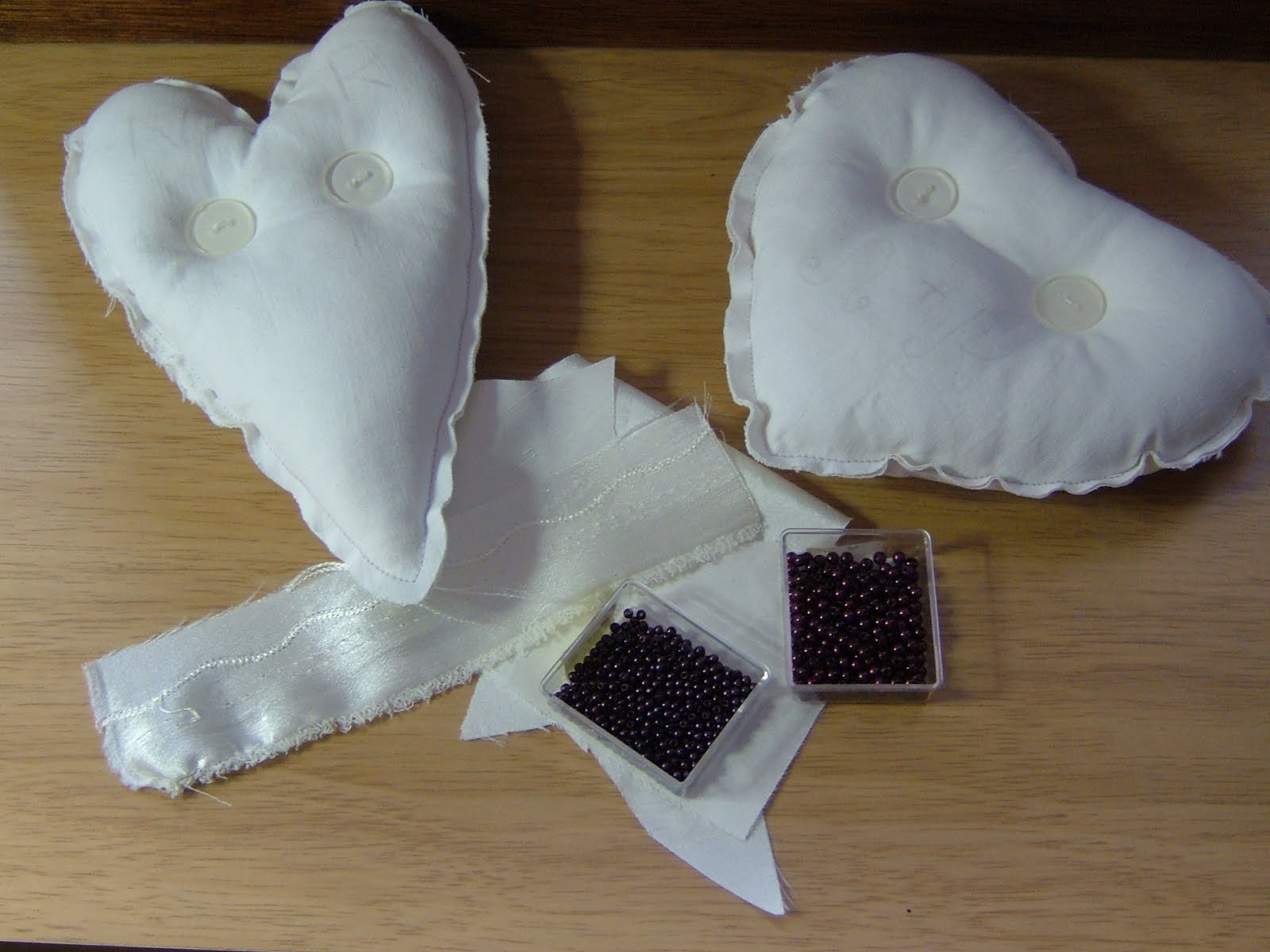 So I set to and made a couple of cushions up in cotton sheeting in different shapes ,supplied satin material swatches and purple beads (wedding colour theme is purple) for a choice to be made. I also asked what embroidery stitch they prefered, plain or swirly.