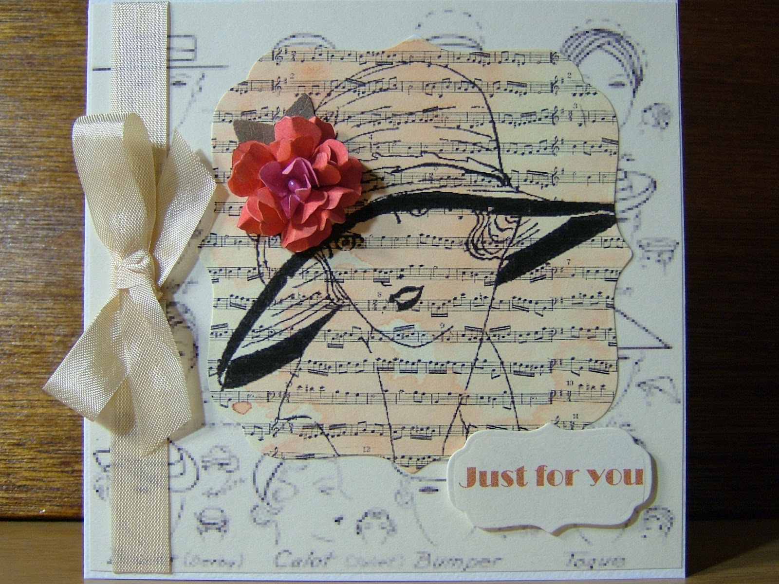 This is so vintage & lovely. Your background paper is so perfect with this image...and the music behind the lady & her rosey hat...well, makes me long for the flapper days! (No, even I am not that old! But I watch movies!!! LOL). Stunner of a card, & sorries for being so slow to get around for a visit. Will try to do better. Hugs.