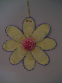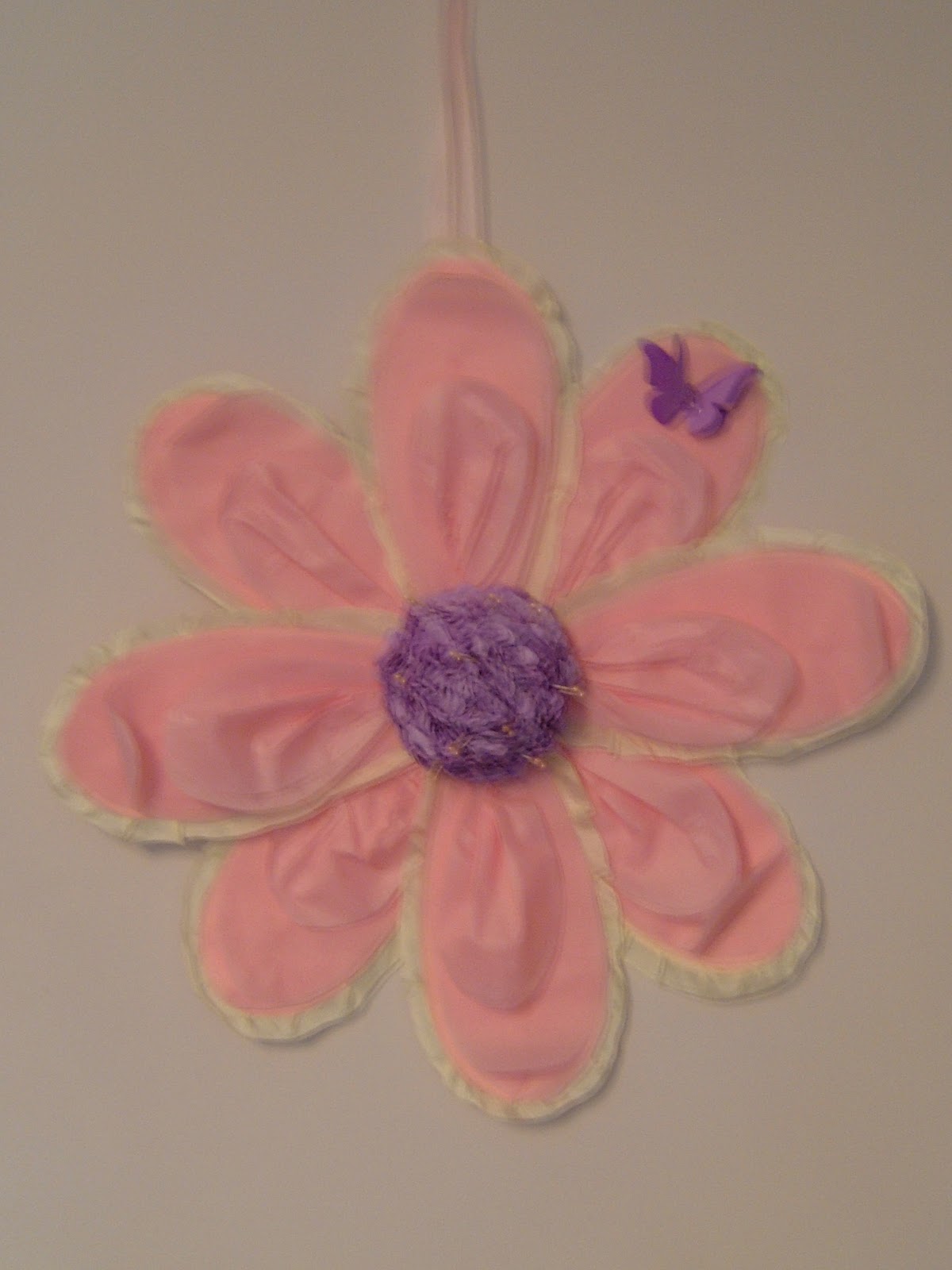 Fluff asked me some time ago to make her some dinner plate size flowers for her new craft room walls. They are now in situ so I can show you. Colours asked for were pink, cream and mauve so I have alternated them around on each flower.  The large petals are made from coloured craft stock with matching petals of gradiating size in tissue paper and edged with satin ribbon which has been frilled.