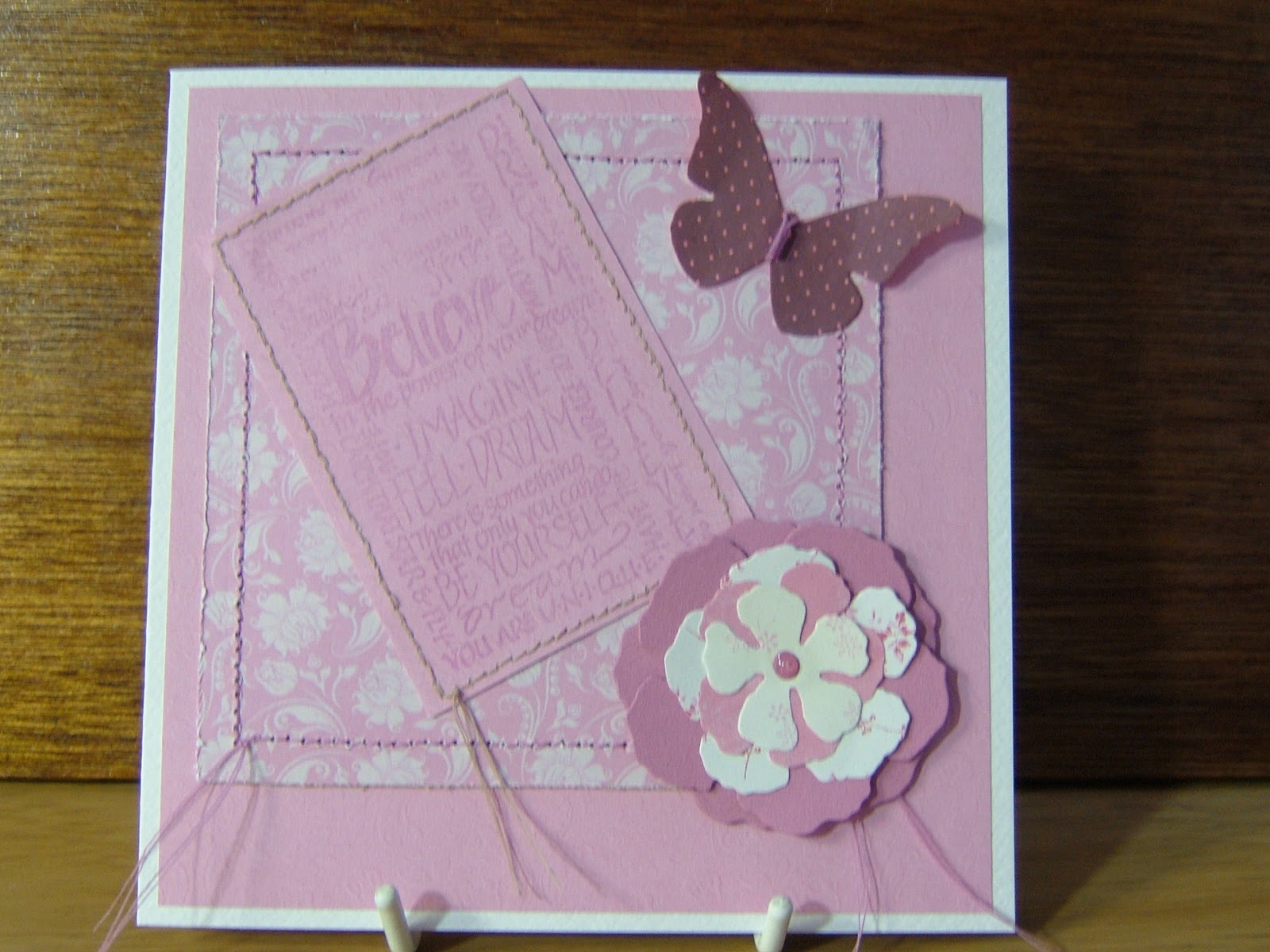 This is a card that I made for a recent swap. The swap required two pink cards you can see the second card up above where I will be posting it shortly. I wanted to make a shabby chic style card with stitching. The stamp is a favourite of mine by 'Crafty Individuals'. I have layered up various backing papers by glueing to cardboard and then distressing the edges and hand stitiching a border. My blogging friend Sherry will be so proud of me as I managed to leave all the threads dangling!!! The butterfly is made with a punch that I snuck from Fluff (but had to give it back) so don't know who it is by. This is one of the last in my stash.