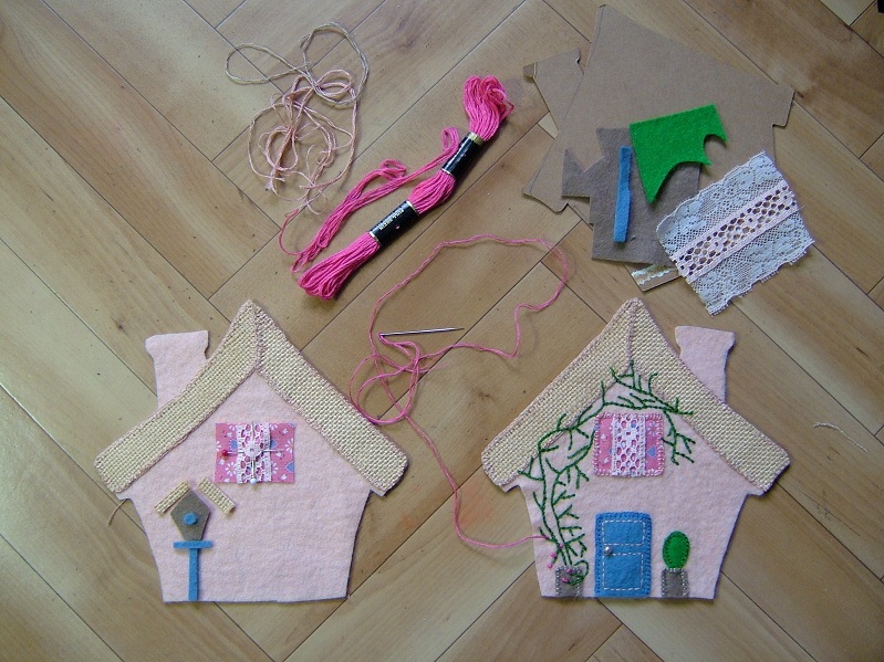 I used a tagbook/mini album house shape to draw round as my template for the base and cut two out from pale pink felt. I raided my stash for all the rest of the items. The thatch is made from thick hessian which I only had a small square of but by careful cutting I managed to do the front and back roofs and even had a small piece over to thatch the bird house! I forgot to take a photo until I had nearly finished the front of the house .