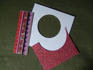 I have had this piece of flocked cardstock in my stash every since my swap buddy Loly in America sent me this small 4" x5" bit of her favourite paper called Red Glitter Love Notes by Making Memories. Well it became my favourite too so only came out on special ocassions to be looked at, stroked and them put safely back again! Looking at the sketch I realised that I would only have to cut half a circle from it so I bit the bullet and made the cut.