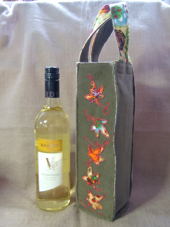 Hi Mrs A, I am so pleased to have this wonderful tote in my household now. :-) It is beautiful and I and my mum love and appreciate the time it took for you to applique those lovely leaves. By the way it fits my sparkling wine bottle perfectly.