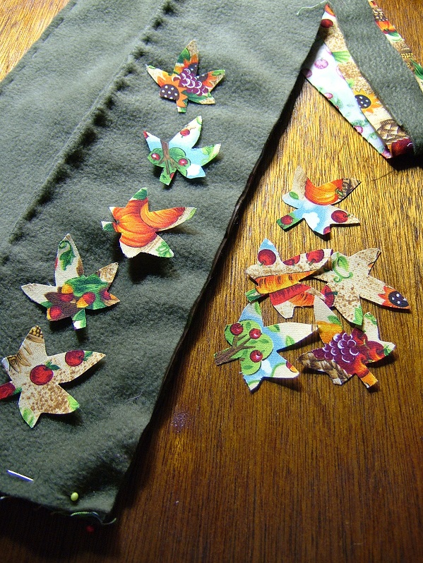 I used a leaf stamp that I had and stamped it out to make a template to cut out some vine leaves to applique on the outside.