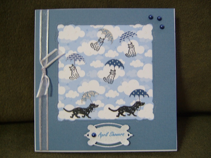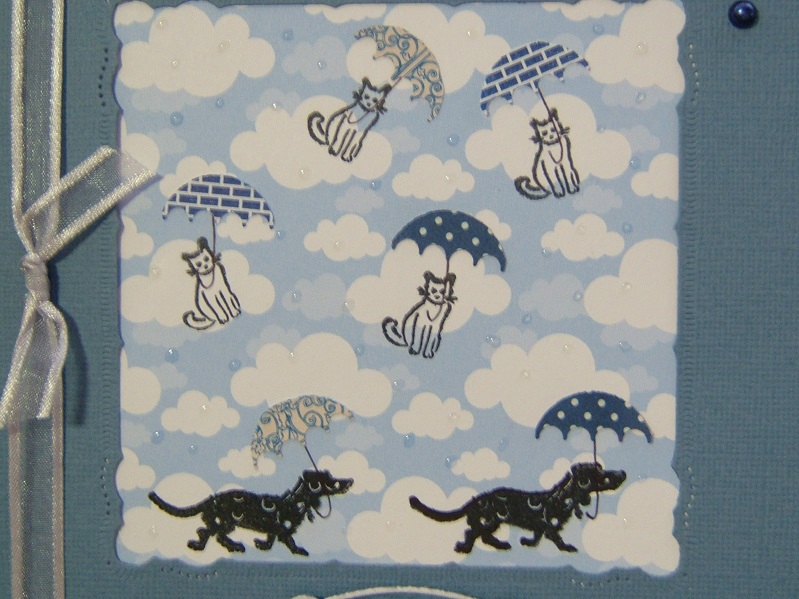 Mrs. A., if only I had your brain; this is FABULOUS! I love the cats with the umbrellas - and the clouds; so cute; glad you didn't leave out the dogs with an umbrella - too, too cute! This card is really the cutest and love how you used your Nesties on the background paper - very clever but then again, that's you in a nutshell - brains and beauty - Doc must be a happy, happy man! ;-)