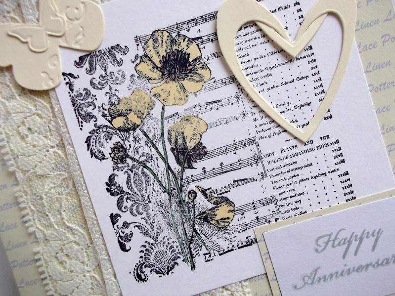 The Web pages that I looked up for Wedding anniversary meanings all said something different for this particular year so I played safe and used all three to create the backing paper on this card. Done in word and coloured before printing off and cutting to size. The Lace is from my snippets box and came originally from MIL's unmentionables.