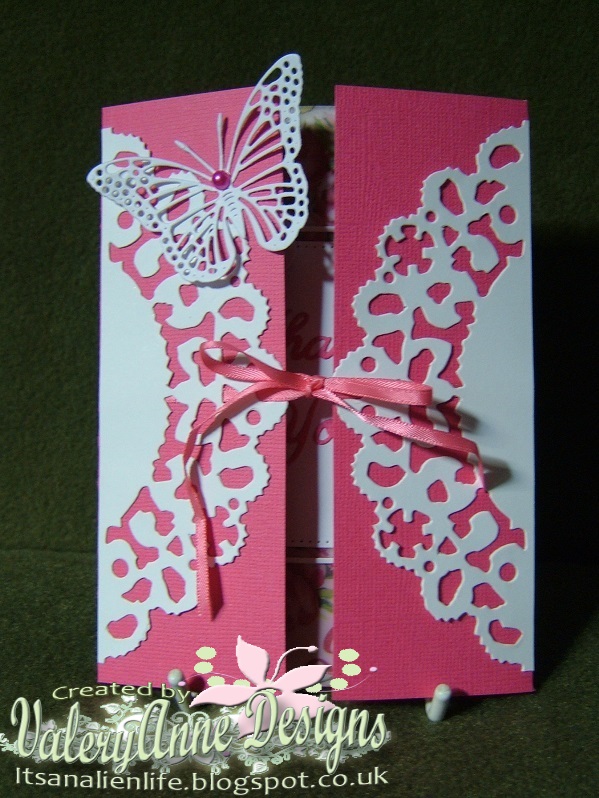 I used plain coloured craftcard for the base which I folded so the sides almost met in the middle. The doily came free in a magazine which I cut in half and turned round so that the flat sides were to the edge of the card. I threaded thin ribbon through the doily pattern and attached behind before gluing the doily to the pink card. The butterfly is a Cheery Lyn die