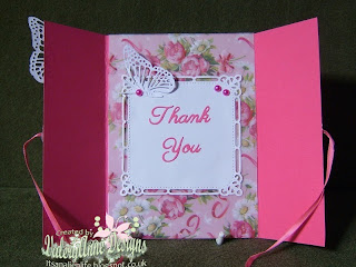 When you untie the ribbon the card opens p to reveal the message inside. The rose patterned paper is made from Vellum and is by KanBan. (For a company that has ceased trading there is still a surprising amount of their goodies to be found. I got this from Joanna  Sheen). The die cut is by Spellbinders Majestic Elements S4-383. Word die is by Britannia.