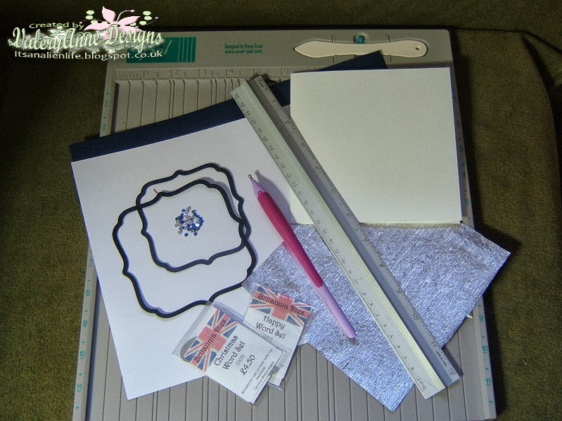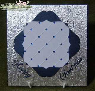 I have used my Scor Pal to create a grid pattern on the smallest nesting die which I have then embellished with the blue gems, matted onto the navy nesting die and then onto the silver as my backing paper. Sentiment cut from the navy cardstock.