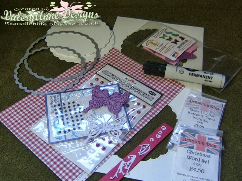 Red/black pearls, black marker pen, card blank, sentiment word dies by Britannia.