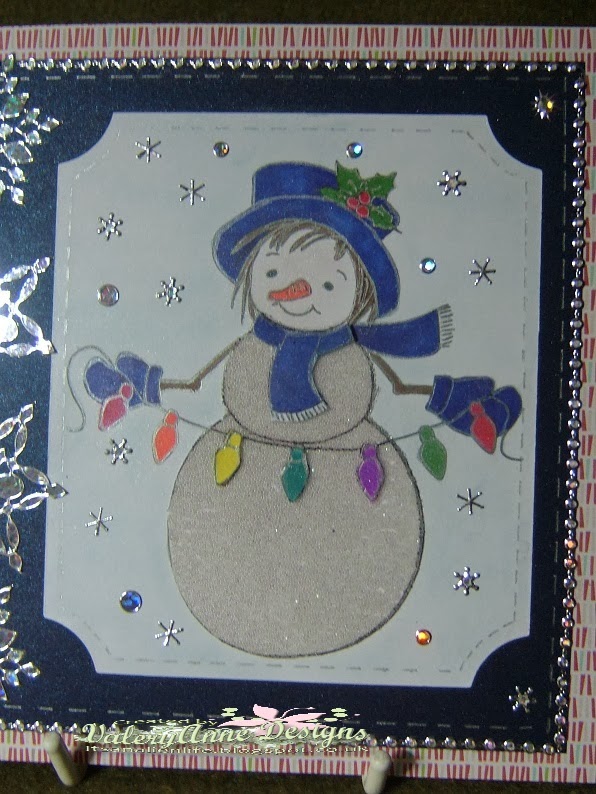 I printed the image out 3 times and on the base layer coloured in using Graph' it pens, white pearlescent chalk on her face with a dusting over her hat, gloves , scarf and silver gel pen to highlight round the edges then pale blue pearlescent chalk on the background. Second image I cut the snow lady's body out and stuck to a sheet of double side sticky paper. Trimmed round the edges and then peeled the other side of sheet off and covered with micro beads. The third image I coloured in the fairy lights (on the body) and the scarf and then cut these out and added on top of the micro beaded body. You do get a slight 3d effect. Backing paper is from the Back to Basics Christmas pack that I used on the card from yesterday. The plain navy is two sided pearl paper (Anna Marie Designs) and has a lovely sheen to it. I layered these up and then added the image on top. Edge on blue and surrounding edge on image have faux stitching in the silver gel pen.