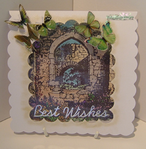 You can form your arch from flowers or maybe you have a stamp/die cut with an archway, A corner die cut makes a perfect arch when two are placed together to make the curve at the top. You are free to use what other embellishments you would like + your Butterfly of course. (Even an archway made from lots of little butterflies).