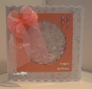 It's a lovely shaker card, with that gorgeous bow! Like the big scallop circle with all the 'shakies' and the pretty background dp. TFS & Hugs.