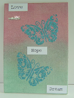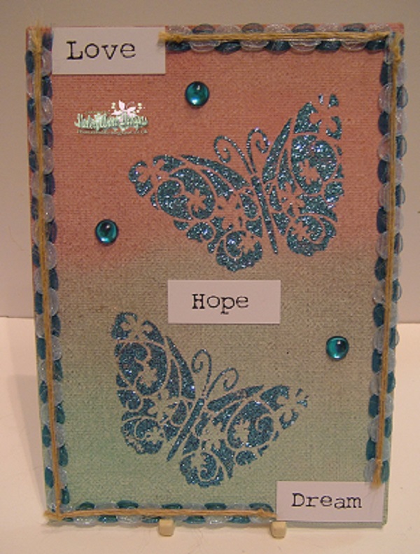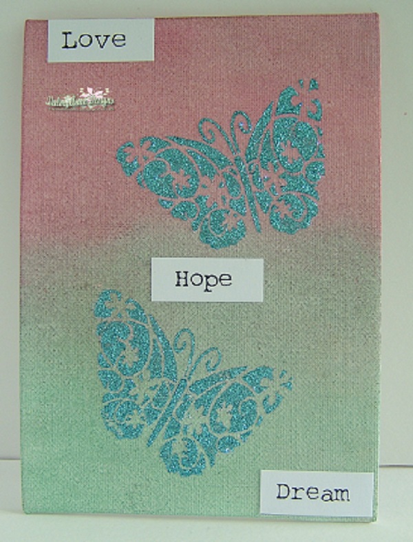 I started with a blank canvas paint flat block and using various SU ink pads and sponge pads created the coloured background. The butterflies were made using an imagination Crafts stencil 'Butterfly Flight' and Imagination Sparkle Medium in Blue Sapphire which matched my Teal paint chip perfectly. The words are preprinted on strips and come white on black or black on white and were in my stash. I then sat and looked at it for two days as it just looked plain and too CAS for my liking.