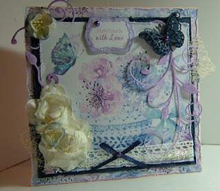Your card is really a delight, I enlarged the photo and I have seen all the pretty details! Fabulous design, with the distressed edges of these lovely papers, the lace and the big swirls! The flowers and the gorgous 3D butterfly match very well with the butterfly on the dp and love the sparkling here and there!!