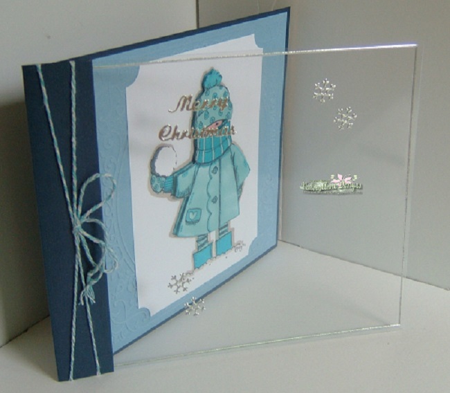 Well, you've certainly entered 2 winners to this fun challenge. Your Christmas card stash must be a huge one. (I've been trying to clean out some of the ones I've saved for years!) This was the perfect one to fit the bill for this challenge too! Also loved Mr. Blue Valerie too. You're a wonder with the acetate technique, and I like the way you've done the hinge and twine, adding some 'snow' on the acetate front. Love that elegant EF with this little cutie. Well done, hope you get a rest now! TFS & Hugs