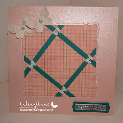 I have used a pink pearlised card base which I have used tent style and die cut the centre out using Spellbinders Majestic Elements 'Marvelous Squares'. The checkered paper is a freebie from Simply cards and Papercrafts by Nitwit from their Spring Whimsy Collection. The butterflies were on my desk and had previously been punched from some paper I had Marbled. The strips of cyan card were from the card I first started and was really just playing around with them on this card but I rather liked the effect so they stayed put! I used an SU punch to cut the backing for the sentiment and pearls from my stash. As I have used snippets I'm off to the playground to join in the fun and make sure Miss Di is not telling tales about me. (I still don't see what the objection to the plastic bags was. I thought it was a good idea myself!!) We did have fun on our Weekend escape and laughed till we cried. Next time we are set loose I'm taking a spare pair of knickers with me !!