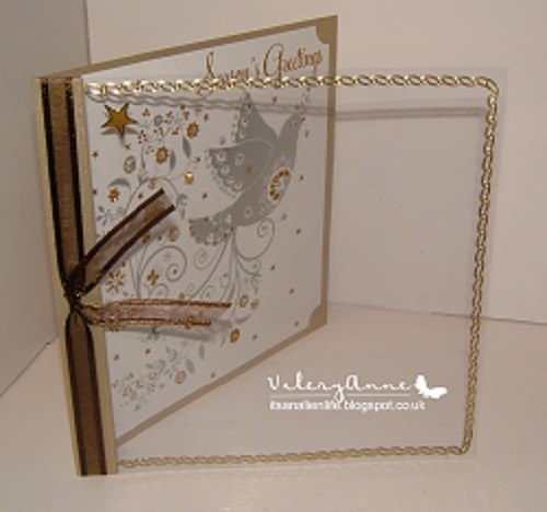 Thanks for a fun challenge. I've enjoyed seeing some gorgeous cardinals, (which would have been my choice if I'd gotten my act together sooner!)Love how you've used the recycled bits to make wonderful new cards. Your way with acetate is amazing. Adding the gold borders around the acetate, certainly sets off the framing too. Great images on both of these, and I like that you've used a 'serene peaceful dove' along with the fun festive geese. And just loving BOTH of your new redesigned blogs! Big hugs & TFS