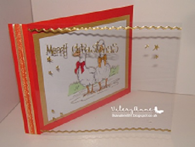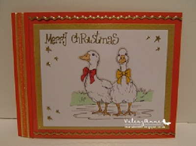As I am also trying to use all my christmas stash of stamps/digis for my cards I had a search of my files and found this digi by Just Inklined called 'Goose and Ganda'. I coloured the image fairly CAS using my promarkers. I adhered to Gold fleck card stock which I then attached to red card stock.