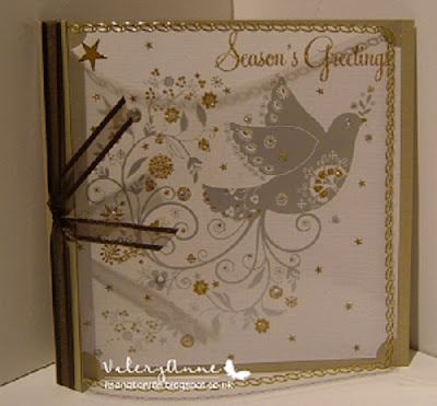 So straight to my box of used christmas card fronts and I found this dove card. It really didn't need much added to it so I just trimmed it down gave it some fancy corners and attached to gold card stock.
