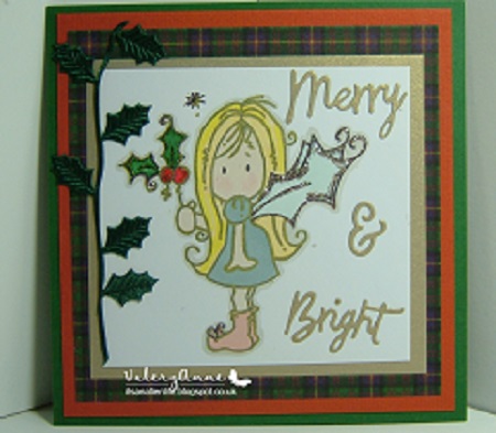 My second card using a cute digi by Bugaboo called Mistletoe Fairy. I have coloured her using my promarkers, a gold gel pen and platinum stickles. The sentiment is a die cut by Xcut. Cuts beautifully and easy to remove from the die. The plaid paper is a freebie from Making Cards Christmas Edition 2015. The holly is a ribbon from my stash . The packet says it is from The Ribbon Girl.