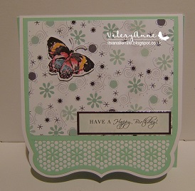 The first card is a bit special as I have used a Tattered Lace die set that I have recently won which was part of the Candy on Sue's Crafty Corner Blog. Thankyou Sue. This set is going to fast become one of my favourites to use. I cut the the front of the card shape (from an existing card blank) using the largest of the label dies and only putting my cutting plates on half of the die as I wanted the back of the card to remain square. Then I used the next lable size down and cut from half a sheet of mint green card. The remaining piece was used to matt inside the card. I then chose the Edge 3 mat to cut the pattern on the green card. My Big Shot is getting a bit old and worn now so I found I needed to run it through on several passes and move the die round to a different position on the plates but it came out fine and the little pieces all fell out cleanly. Looking through my digi papers I found this one from Funky Hand's 'Minty Madness Collection' paper No5 and it had a very similar daisy pattern on it which looked good with the die edge. The butterfly was a freebie from Making Cards and was on a sheet called Florals and Flutters. I trimmed a wide edge round the butterfly first and glued onto a scrap of white card stock to strengthen and then fussy cut more closely. Sentiment is a ready made one from a Hunkydory Set in my stash.