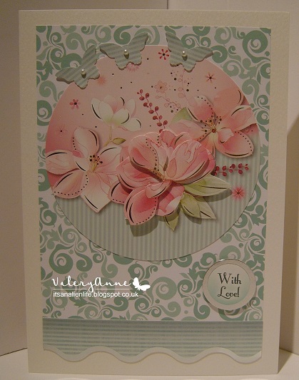 My second inspiration card for you uses another paper from the same Minty Madness set by Funky Hand No 19. I used cream card stock to make the base card and adhered the paper to the front. The embellishments are from a ready made decoupage set by Hunkydory. I cut the butterflies from a left over piece of the edging strip and placed around the top of the circle (thus making another edge for the theme). The pearls were from my stash.
