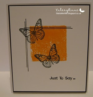 I simply used a snippet of white card already out on my desk and as the box of Distress Ink pads was also out on the floor ( currently being used on another project) I pulled out the Spiced Marmalade and inked straight onto the card. Micron black fine liner pen used to draw the random lines and then the butterflies stamped with Memento Tuxedo Black using a small wooden stamp by Dovecrafts. Backed onto black card and then adhered with 3D pads onto a white cardstock base. Simples!!