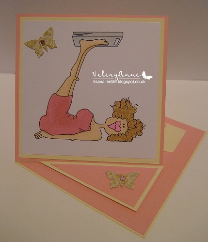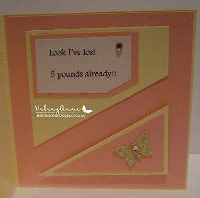 I remembered that I had this Scribbles Designs digi called 'Weigh in Diva' and I thought that the scales would be perfect for Libra. I have made a twisted Easel card this time. The Pink and Cornish Cream cardstock came from my stash. I created the sentiment in word and printed off the punch line. Butterflies were punched out already from scrapes and I layered 3 up on each butterfly to give a bit of substance to them. A pink gem finished them off.