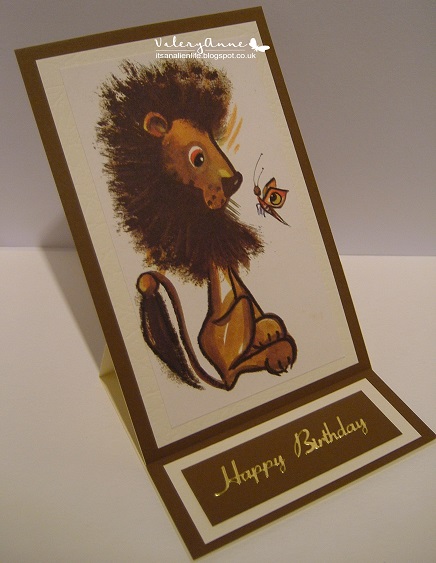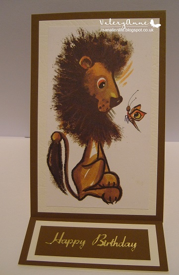 I have literally had this card front in my used card box for ever and a day. It was a birthday card received by my son and I had kept it because it made me smile. Not only that but when I pulled it out to use, it also had the little butterfly on it! I have made an elongated easel card to show of Leo.