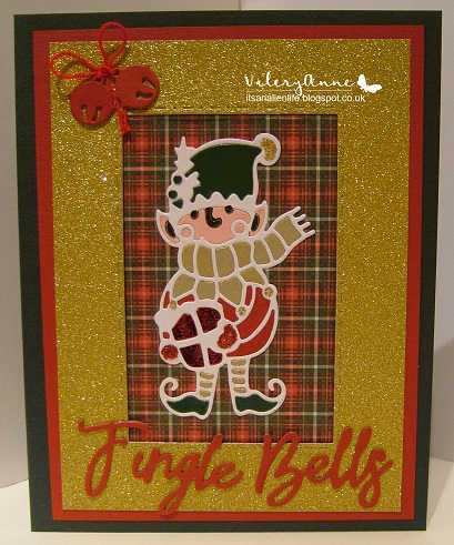 Second Card uses a pixie diecut from Tonic called Santa's Helper. More of the glitter card and using the same die cuts for the sperture. The sentiment is a die by Xcut and the the little bells are part of it.