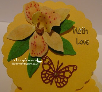 This card nearly never made it to production. I had intended to make the flower from paper using this ' Cattleya' Flower Die from Sizzix which is by Susan Tierney Cockburn but I just wasn't happy with the result. I made another one and that got binned as worse than the first and by now the clock was seriously ticking. In desperation I thought I would try making it from flower foam and sculpt it rather than use a heat gun or iron as the petals need to be quite open and stand up. This is the result. The best bit is the leaves as I got the viening just right on them!!
