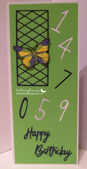 A delightful and clever birthday card. Love that trellis, the way you did the birthday numbers (gosh he's just a youngster!) and also the way you met all the "N" requirements along with the lovely butterfly! TFS & Hugs