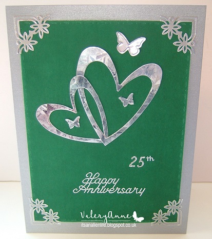 The card base is made from silver satin cardstock to which I have mounted a sheet of green vellum held in place by the silver corner stickers. The hearts and butterflies are from my stash and a part of several different ones that my lovely blogging pal Di gave to me a long time ago now and I am slowly/reluctantly using up on my cards. The sentiment/numbers are silver stickers from my stash.