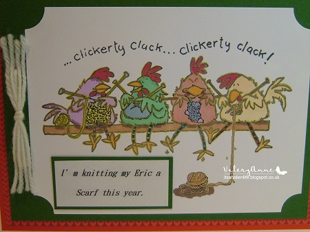 Lucky Eric! Wonder what he'll get next year! Fabulous and fun card, brilliant idea to keep to last years theme ...love those knitting chickens!