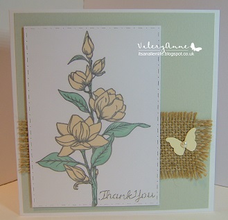 Image has been attached to card to strengthen and then adhered to front of card using 3D pads in order for the strip of Jute to be glued to cardstock behind Silver sentiment and punched butterfly from my stash.