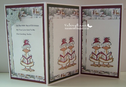 What a darling card, ValeryAnne! Too cute with your five caroling ducks and gorgeous background paper. I especially like your surprise card fold! Merry Christmas! hugs, de