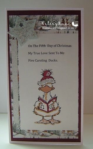 Time for the girls in the Christmas card club to show our last card for the current year . Slyvie asked for cute so I'm hoping that 5 Caroling Ducks are deemed as being cute. (Well they are if you don't hear them singing!). Sorry post is a bit late girls but it is a bit busy here at the moment having to keep all these ducks fed and finding water for them to swim on.