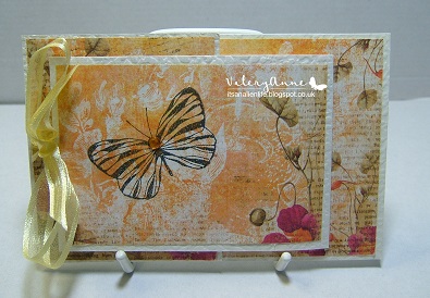 The design paper is by Raspberry road and came as a freebie in a magazine. By careful cutting and placement of the paper I have managed to retain most of the pretty floral design which was only down the outside edges. The butterfly is a freebie stamp from Paper crafter Magazine which I stamped onto the design paper.